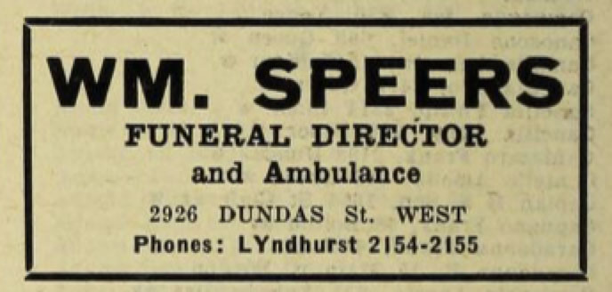 Business records show how the undertaking industry was being transformed at this time: from one where the principal activity had been providing (often constructing) and then transporting coffins from home to cemetery to that where the funeral director became an on-site custodian of the recently departed with all that entailed. These changes were not only a direct result of the impact of the First World War (followed by a pandemic) but also due to society’s changing attitudes to death and dying. The 1920s and 30s also brought technological advances in the construction of coffins and embalming techniques. The prominence of Speers’ and his uncle’s business presence for four decades in this section of Dundas West shows how well they adapted to their industry’s evolving needs as well as to the expectations of their clientele.